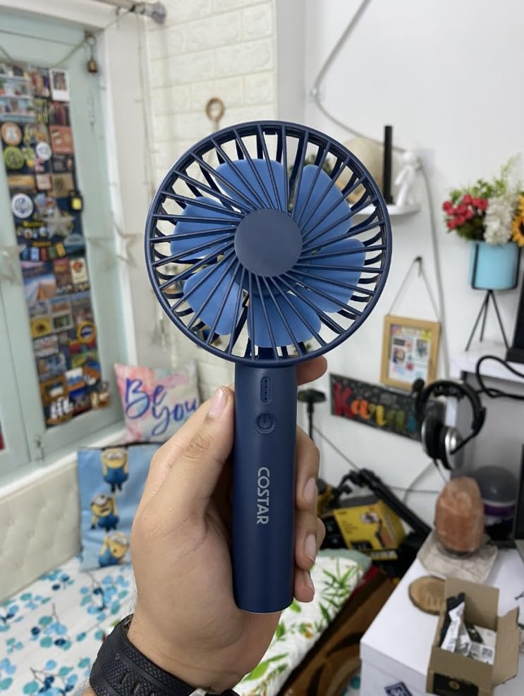COSTAR’s Portable Mini Fan (Blue) with a 1800mAh USB-rechargeable battery and creative light features 3 speeds. Its brushless motor ensures quiet cooling for women, men, or kids, ideal for indoor or outdoor travel, offering stylish, portable comfort in summer.