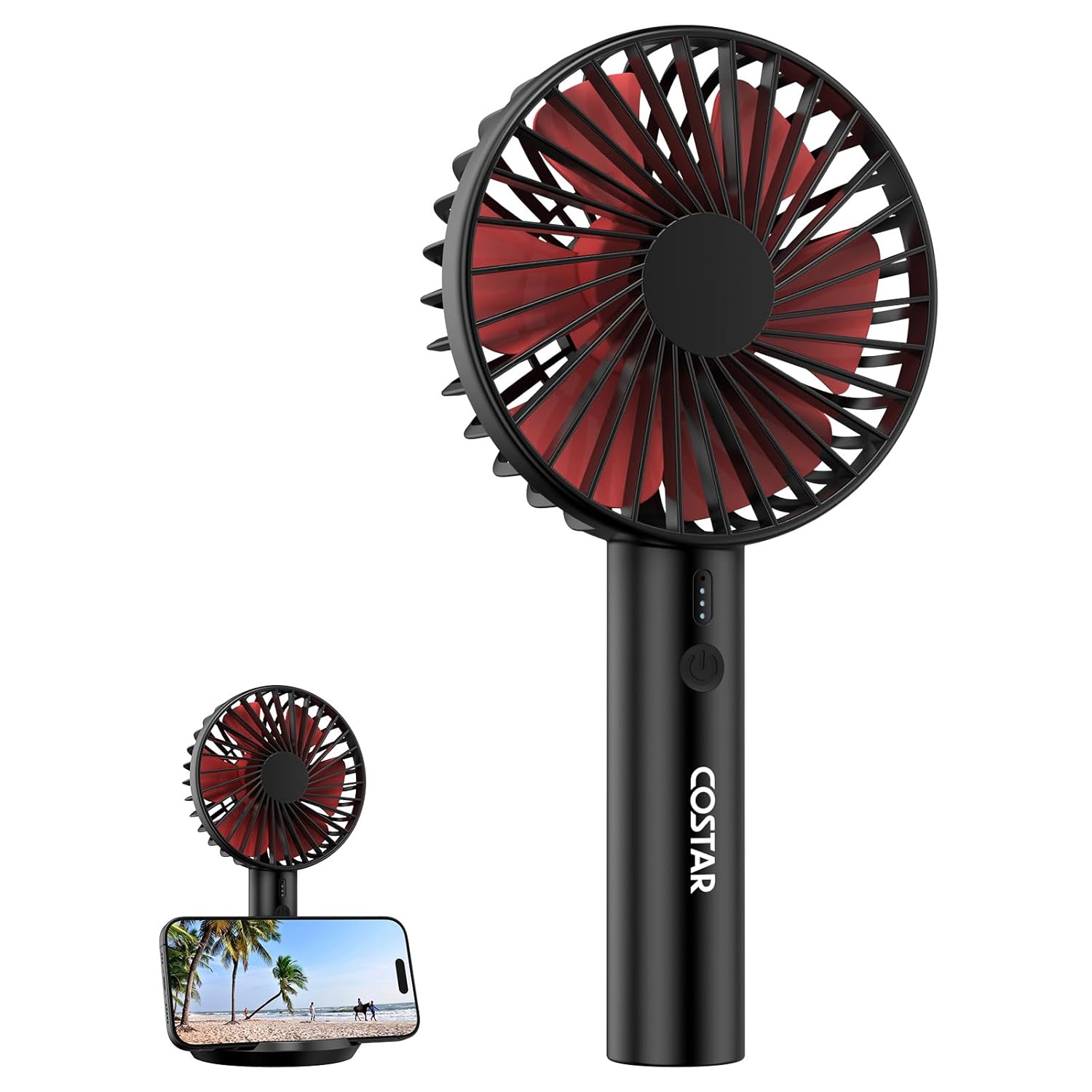 COSTAR’s Mini Portable Fan (Black) with a brushless motor and 1200mAh USB-rechargeable battery offers 3 speeds. Featuring a table phone holder base, it’s perfect for women and men during summer or travel, providing quiet, portable cooling for desks or on-the-go use.